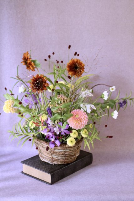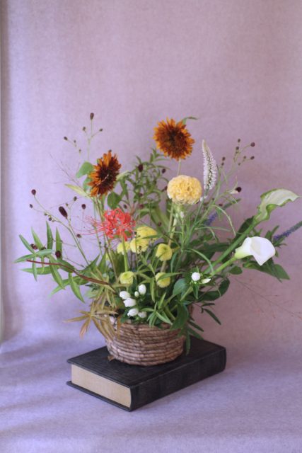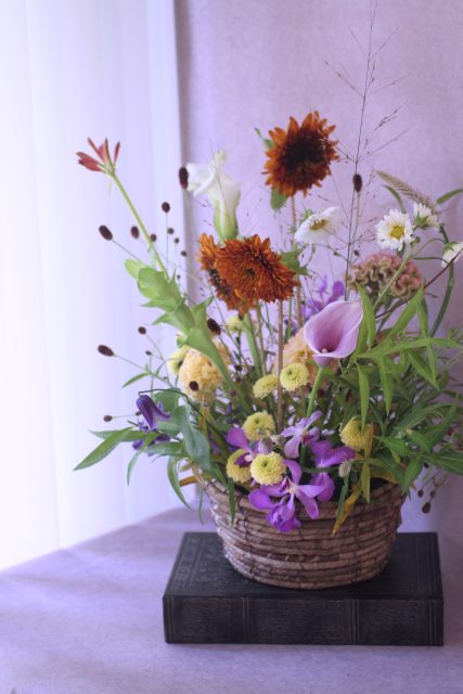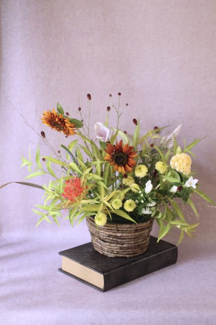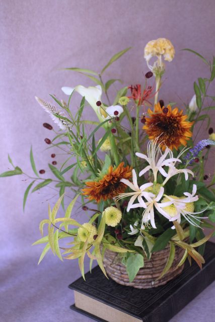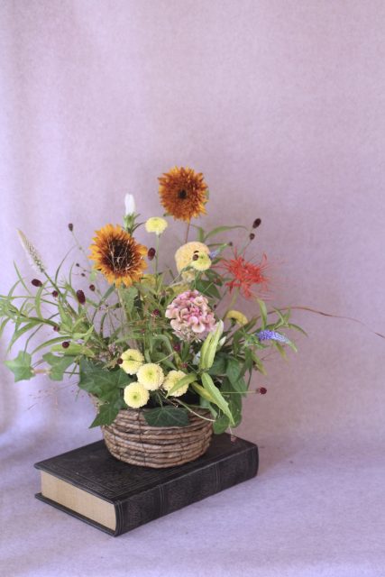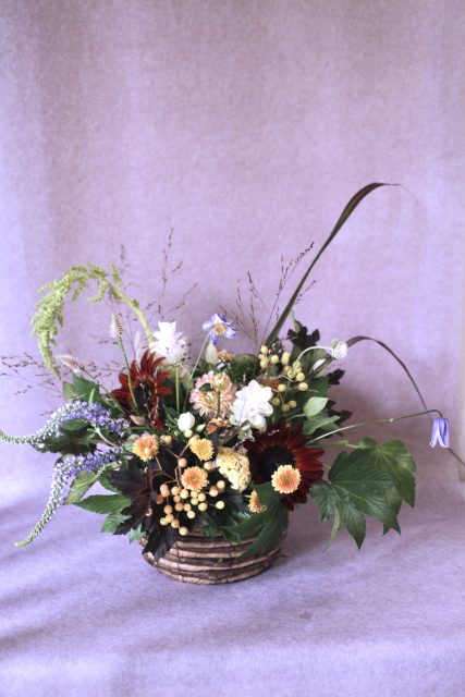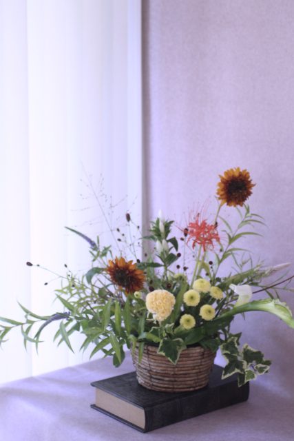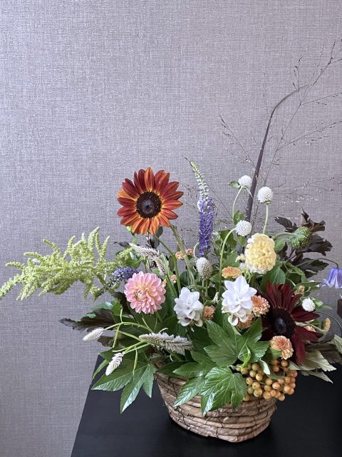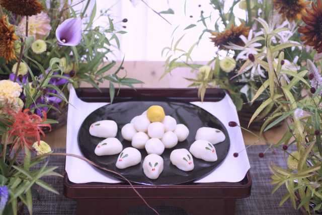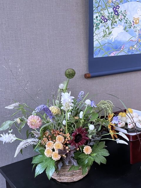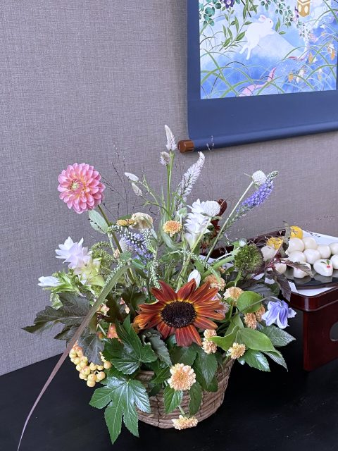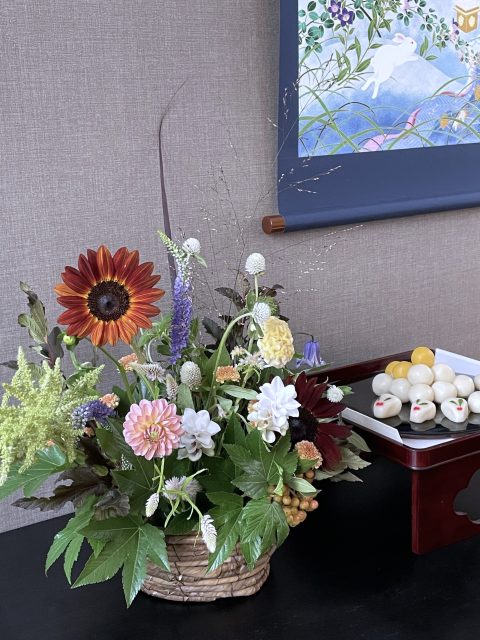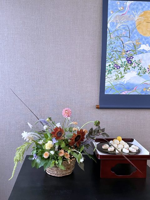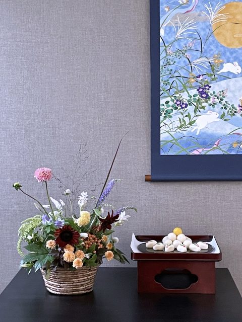 9月に入り、朝夕の風が少しずつ涼しくなってきましたね。この時期に訪れる日本の伝統行事「十五夜」は、満月を眺めながら秋の実りに感謝する風習があります。今年の十五夜は10月6日だそうですが、教室では一足早く秋のお花のアレンジメントとお団子を飾り皆んなで和やかなひと時を過ごしました。