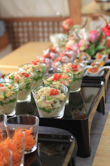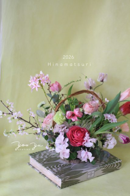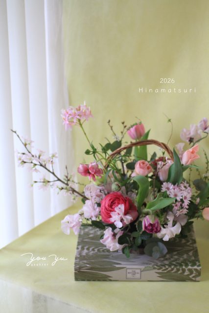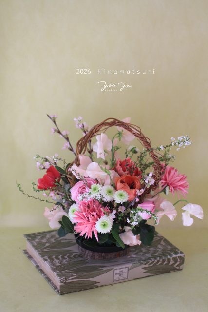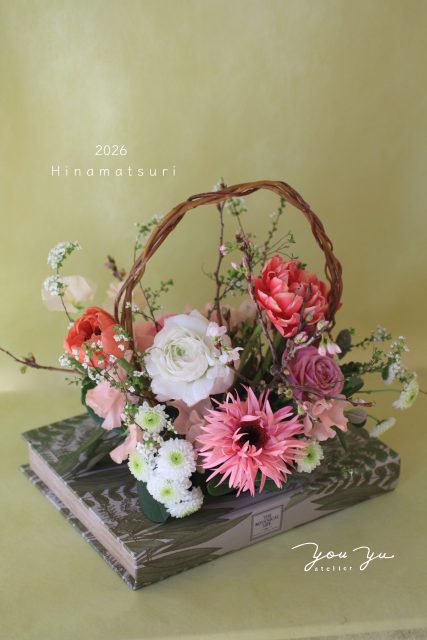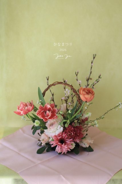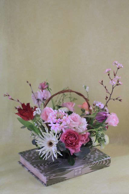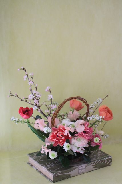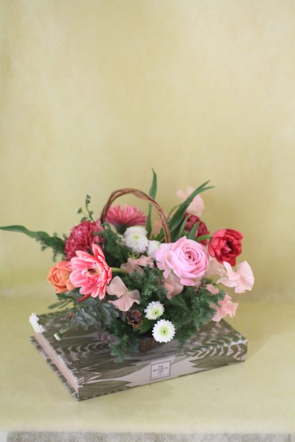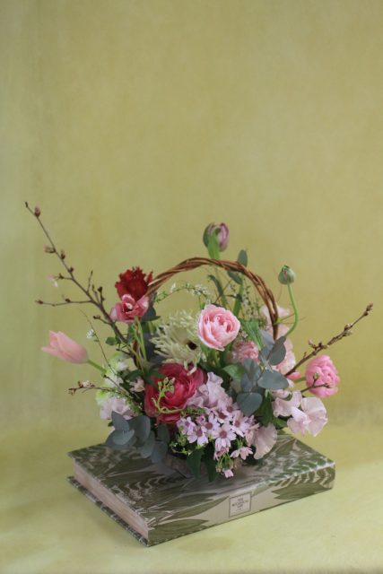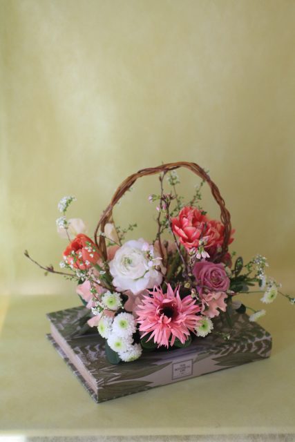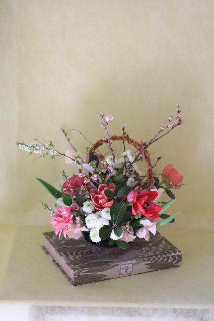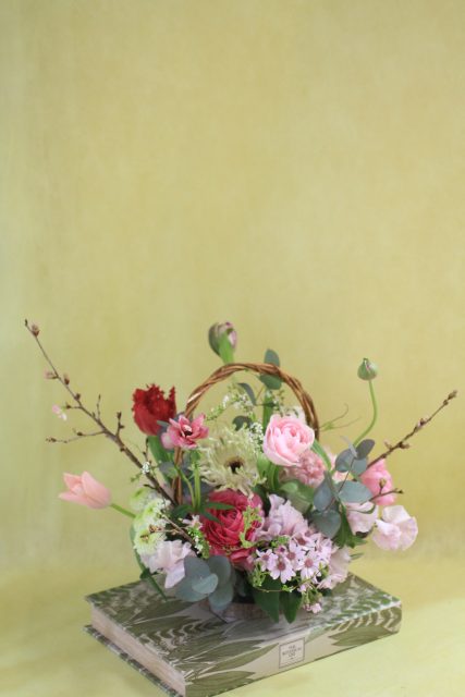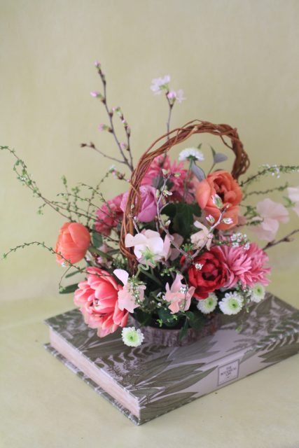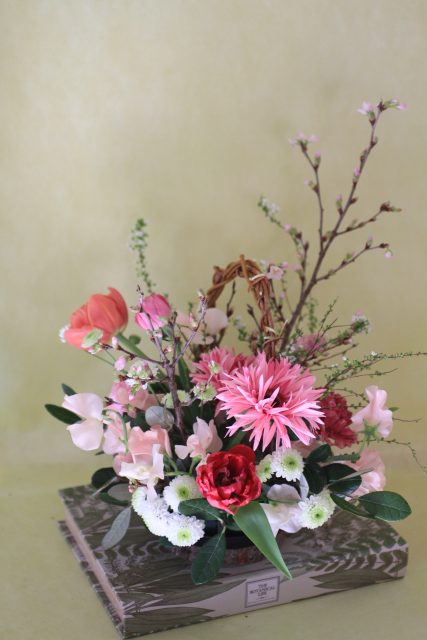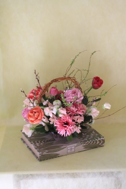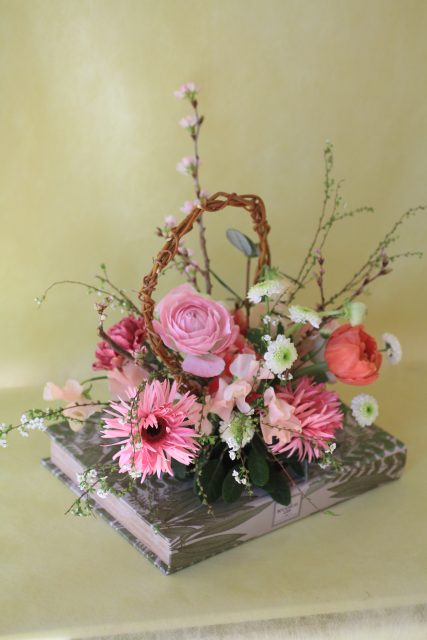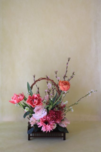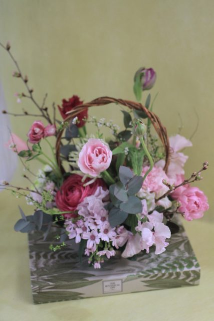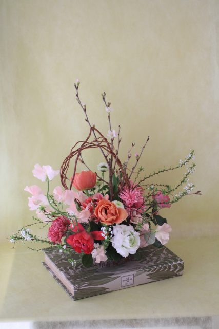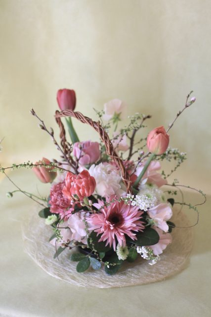 スタンダードの皆さまには、持ち手付きのバスケットに生けてるようなイメージで、取手部分だけを雲龍柳で編んでいただきオアシスにつけてお花をアレンジしていただきました。