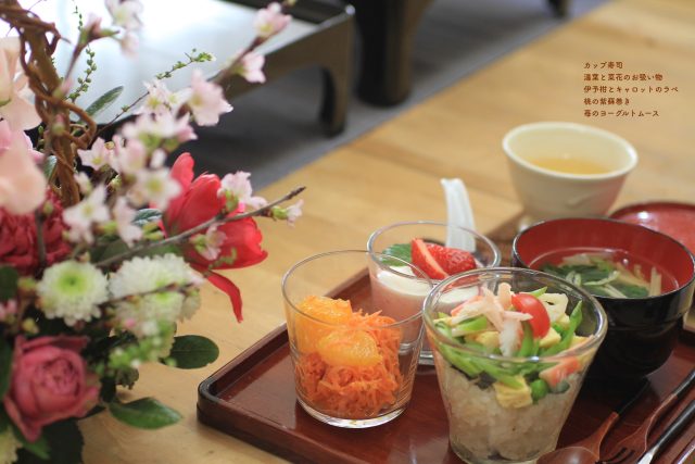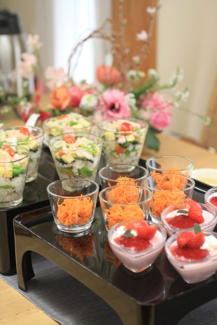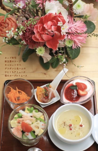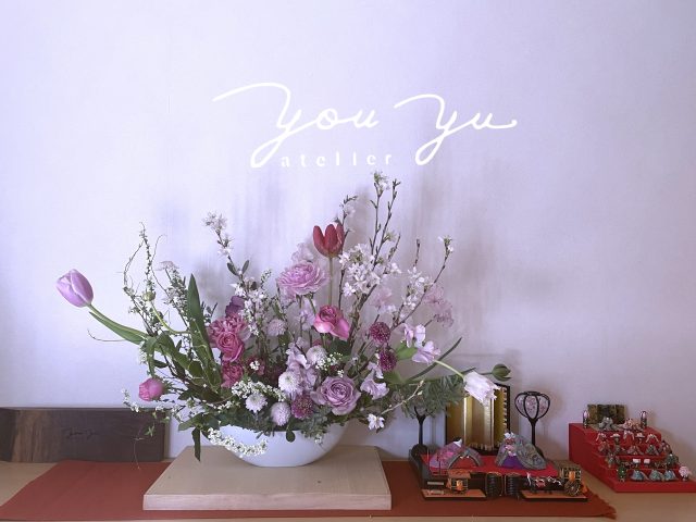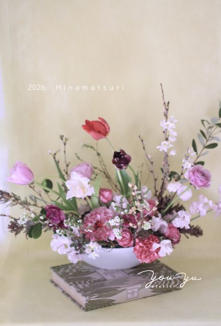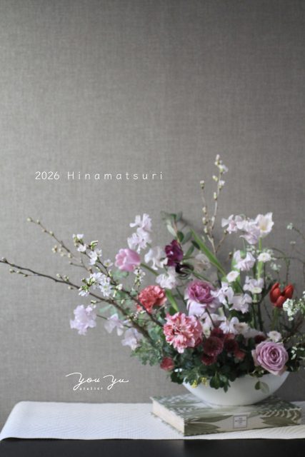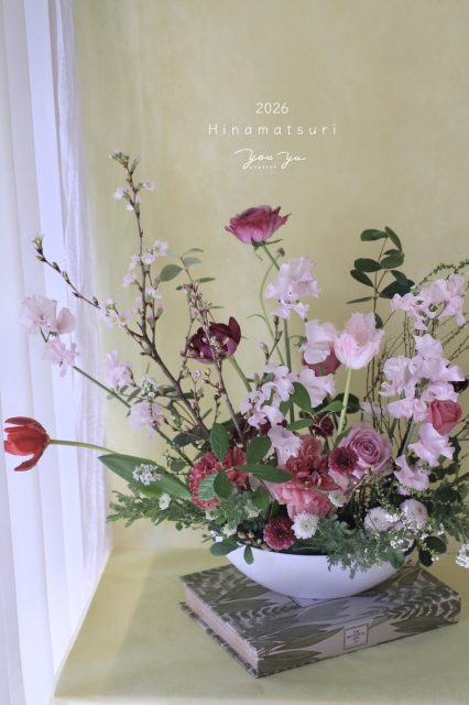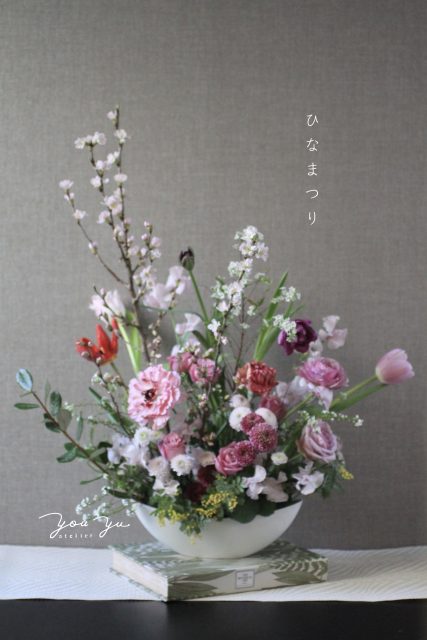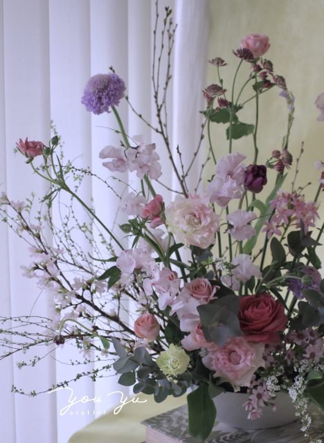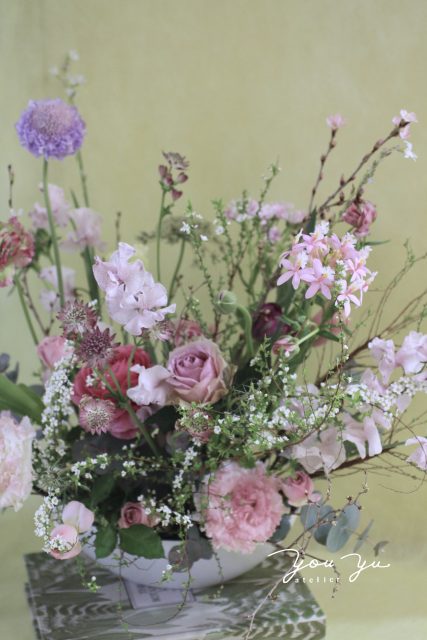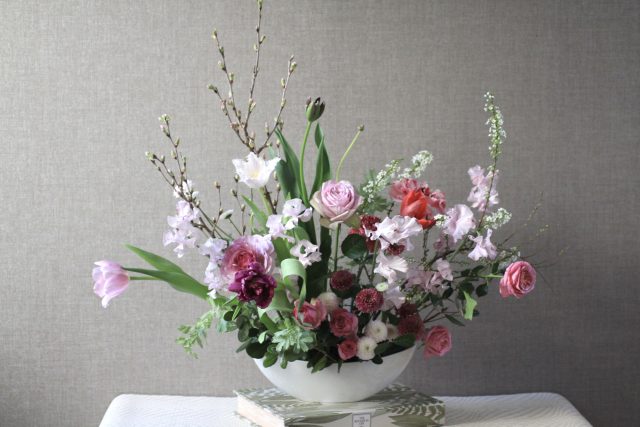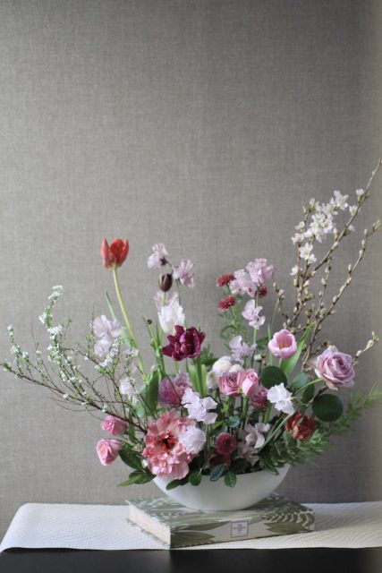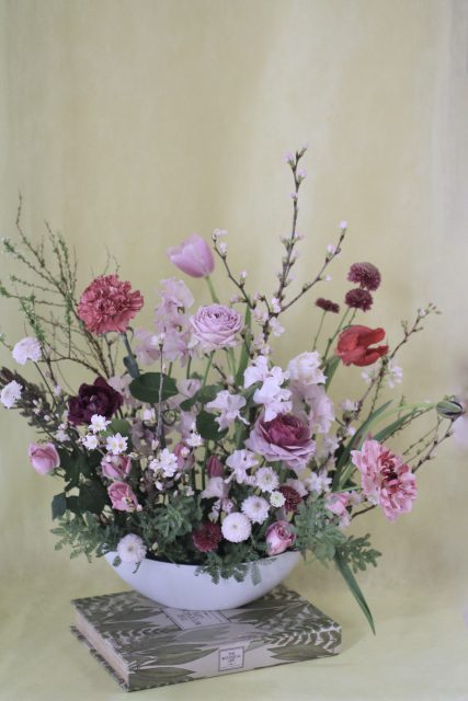 今回のレッスンは、プレミアムの皆さまには花それぞれの個性を生かして、ふんわりエアリーに自由にいけていただきました。